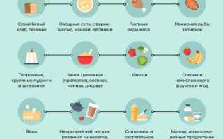Сухой белый хлеб, печеньеОвощные супы с вермишелью, манкой, овсянкойПостные виды мясаНежирная рыба, заливноеКаши (гречневая (протертая), овсяная, манная, рисовая)Творожные, крупяные пудинги и запеканкиМолоко и кисломолочные продукты не более 2% жирностиЯйца